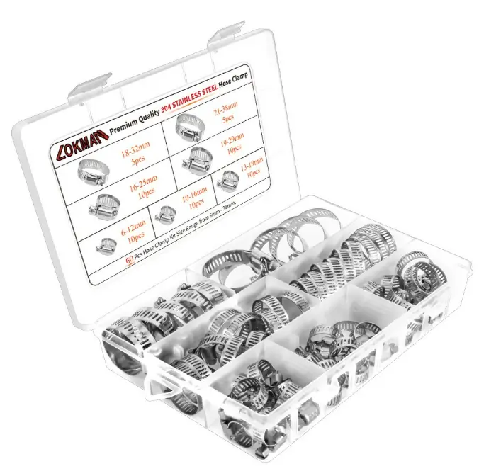 LOKMAN Stainless Steel Hose Clamp Assortment Kit- 60 Pieces, Adjustable 1/4”- 1-1/2” (6-38mm) Worm Gear Metal Fuel Line Clamp for Plumbing, Automotive And Mechanical Applications