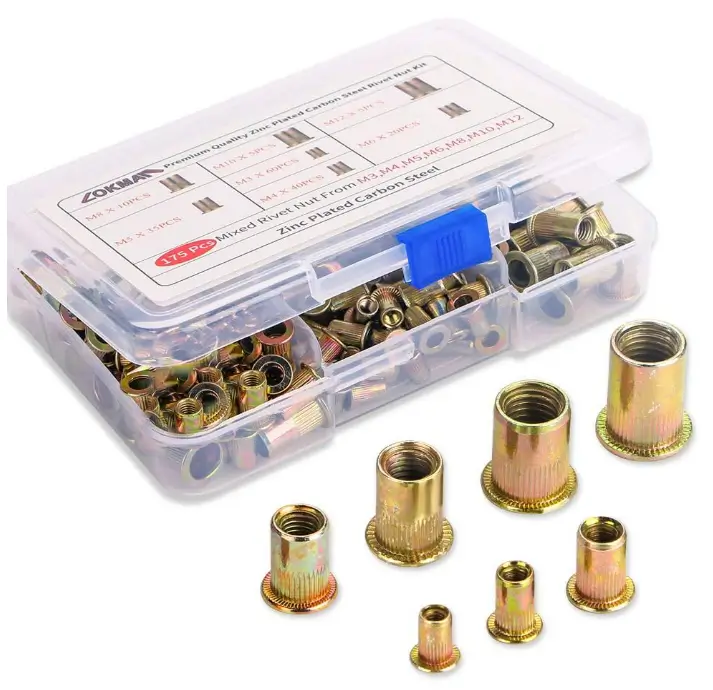 LOKMAN 175PCS Metric Rivet Nut Kit Carbon Steel Flat Head Threaded Insert Nut Assorted in M3 M4 M5 M6 M8 M10 M12, Knurled Body (Rivet Nut Kit 1)